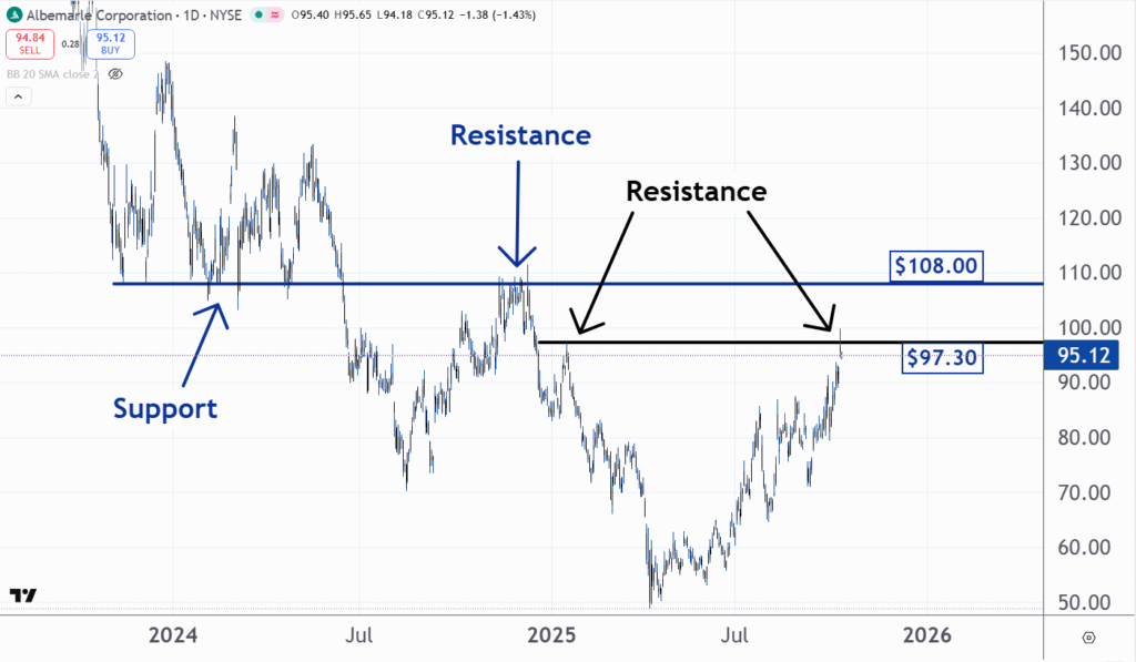 In January 2025, Albemarle found resistance at $97.30. When the price dropped after, some of the people who bought stock at the peak came to regret doing so. They decided to sell at breakeven if they eventually could.
